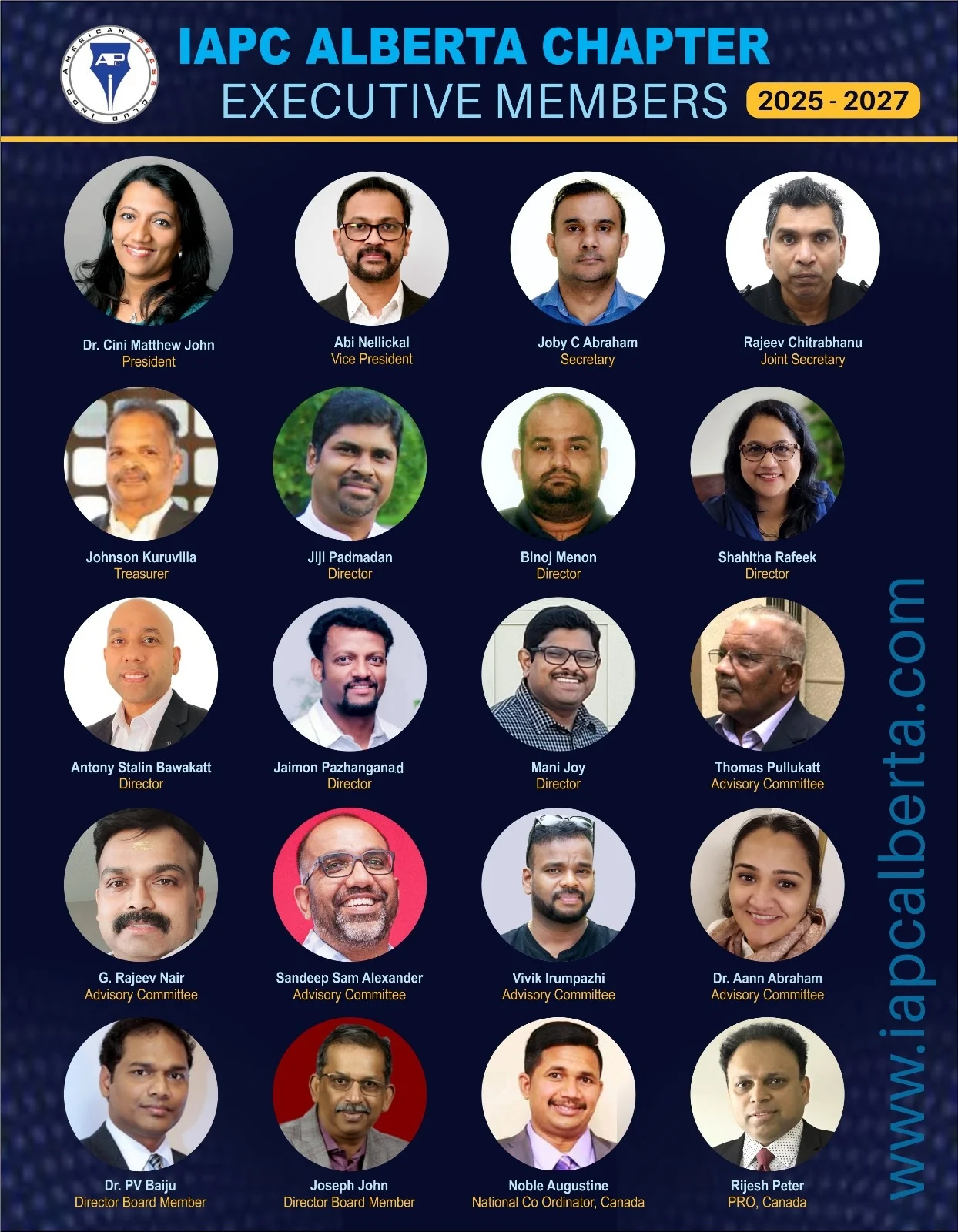 Executive Members: 2025 - 2027 Dr. Cini Matthew John President Abi Nellickal Abraham Vice President Joby C Abraham Secretary Rajeev Chithrabhanu Joint Secretary Johnson Kuruvilla Treasurer Jiji Padamadan Director Binoj Menon Kuruvayil Director Shahitha Rafeek Director Antony Stalin Bavakkat Director Jaimon Pazhanganad Director Mani Joy Director Thomas Pullukkatt Advisory Committee G. Rajeev Nair Advisory Committee Sandeep Sam Alexander Advisory Committee Vivik Irumbuzhi Advisory Committee Dr. Aann Abraham Advisory Committee Dr. P V Baiju Director Board Member Joseph John Director Board Member Noble Augustine National Co Ordinator, Canada Rijesh Peter PRO, Canada